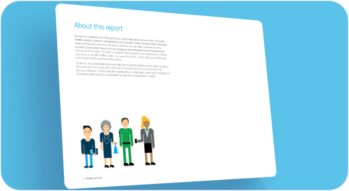 About this report Barclays has existed for over 32 years n our daytoday activity e or ith individuals failies parents students entrepreneurs sall business oners copany C€‚s borroers savers hoeoners and ore ƒe or in schools in counity centres and in ary barrac s Up and don the country our collea„ues are ebedded in counities and are helpin„ the UK to „ro …his report is desi„ned to brin„ to„ether our activity across all of our businesses in the UK to tell the story – in a snapshot in tie – of the difference that Barclays is a in„ to the UK econoy and to society …o do this e collated inforation and data fro across the ban in the UK includin„ ‡uan ˆesources and ‰ourcin„ as ell as fro our Corporate Šersonal nvestent Ban and Barclaycard teas …his data as then analysed by an independent econoist at ‹evelopent €conoics Œtd to produce a coprehensive vie of our activity and its ipact | 4 Barclays in the UK