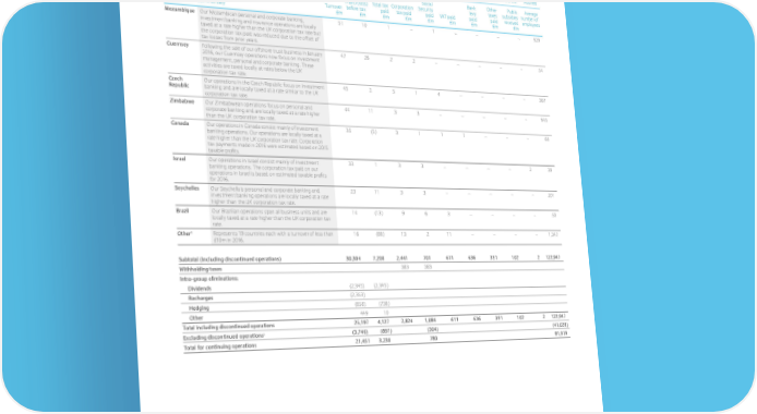 Country by country data Country Snapshot 2016 Audited Audited Unaudited Audited Unaudited Unaudited Unaudited Unaudited Audited Audited Social Bank Other Public Average Profit/(loss) Total tax Corporation Security levy taxes subsidies number of Turnover before tax paid tax paid paid VAT paid paid paid received employees a Country Commentary £m £m £m £m £m £m £m £m £m Mozambique Our Mozambican personal and corporate banking, 51 10 1 – 1 – – – – 929 investment banking and insurance operations are locally taxed at a rate higher than the UK corporation tax rate but the corporation tax paid was reduced due to the offset of tax losses from prior years. Guernsey Following the sale of our offshore trust business in January 47 26 2 2 – – – – – 54 2016, our Guernsey operations now focus on investment management, personal and corporate banking. These activities are taxed locally at rates below the UK corporation tax rate. Czech Our operations in the Czech Republic focus on investment 45 2 5 1 4 – – – – 367 Republic banking and are locally taxed at a rate similar to the UK corporation tax rate. Zimbabwe Our Zimbabwean operations focus on personal and 44 11 3 3 – – – – – 645 corporate banking and are locally taxed at a rate higher than the UK corporation tax rate. Canada Our operations in Canada consist mainly of investment 35 (5) 3 1 1 1 – – – 69 banking operations. Our operations are locally taxed at a rate higher than the UK corporation tax rate. Corporation tax payments made in 2016 were estimated based on 2015 taxableprofits. Israel Our operations in Israel consist mainly of investment 33 1 3 3 – – – – 2 39 banking operations. The corporation tax paid on our operationsinIsraelisbasedonestimatedtaxableprofits for 2016. Seychelles Our Seychellois personal and corporate banking and 23 11 3 3 – – – – – 201 investment banking operations are locally taxed at a rate higher than the UK corporation tax rate. Brazil Our Brazilian operations span all business units and are 14 (13) 9 6 3 – – – – 50 locally taxed at a rate higher than the UK corporation tax rate. b Represents 19 countries each with a turnover of less than 16 (88) 13 2 11 – – – – 1,347 Other £10m in 2016. Subtotal (including discontinued operations) 30,304 7,200 2,441 701 611 636 391 102 2 122,947 Withholding taxes 383 383 Intra-group eliminations: Dividends (2,345) (2,345) Recharges (2,353) Hedging (858) (738) Other 449 10 Total including discontinued operations 25,197 4,127 2,824 1,084 611 636 391 102 2 122,947 Excluding discontinued operationsc (3,746) (897) (304) (41,028) Total for continuing operations 21,451 3,230 780 81,919 a A list of the main entities that Barclays operates through around the world and which together contribute over 90% of the Group’s turnover can be found within the Citizenship section of our website. b The countries with turnover of less than £10m in 2016 are Russia, Netherlands, Cyprus, Gibraltar, China, Sweden, Taiwan, Thailand, South Korea, Australia, Malaysia, Indonesia, Cayman Islands, Qatar, Lithuania, Argentina, Philippines, Namibia and Nigeria. c On 1 March 2016, Barclays announced its intention to sell down the Group’s interest in Barclays Africa Group. The Barclays Africa Group (which includes South Africa, Kenya, Ghana, Botswana, Mauritius, Tanzania, Zambia, Uganda, Mozambique and the Seychelles) meets the requirements for presentation as a discontinued operation under IFRS 5 and these results represent the majority of the amount relating to discontinued operations, presented separately in the Group income statement. BarclaysPLCCountrySnapshot2016 • 15