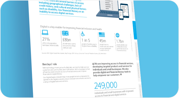 Access to financial and digital empowerment Inclusive financial systems are key to Con t e achieving economic and societal progress. xt and Appr However, there are several barriers to access o including geographical challenges, lack of ach credit history, and cultural and physical factors such as disability, low financial literacy or an inability to access digital services. Shar ed Gr o wth Ambition Digital is a key enabler for improving financial inclusion and health 21% £8bn 1 in 5 45m 1.7bn Gener of the UK population of estimated cost to people of working age in people have no people globally own al S lack basic internet skills UK economy of bad England have a disability credit score and cannot mobile phones but tandar debt per year access mainstream don’t have access to credit in the US financial services d Disclosur Sources: BBC Digital Capabilities Update, StepChange, 2011 Census, Consumer Financial Protection Bureau (US), World Bank es Barclays’ role We are improving access to financial services, Specific S With technology moving at such a fast rate, we need to make sure our developing targeted products and services for customers and communities aren’t left behind. We’ve developed a host individuals and small businesses. We also tandar of learning tools to boost access to financial services and improve financial and digital literacy. provide digital and financial literacy tools to d Disclosur Our Digital Eagles network helps more people become empowered to help empower our customers. operate in the digital economy, reduce exclusion and enhance access to es a range of digital tools and services. KP 249,000 MG Assur individuals and small businesses with improved ance S access to financial and digital services ta t 2016 Progress overview emen t Focus areas Progress in 2016 2017 objectives Developing targeted products ■■ Continued to grow Barclaycard Initial Cards ■■ Enhance and advance the and services for individuals and ■■ Barclaycard Anywhere has continued to grow including the launch development of accessible small businesses of an improved bluetooth and contactless payment solution for products and services small businesses Improving accessibility and ■■ Launched Financial Wings ■■ Continue to develop and enhancing financial and digital ■■ Launched UK Money Worries Hub and access to free credit scores enhance learning platforms skills ■■ Continued to roll out Digital Wings platform ■■ Innovate to deliver functionality ■■ Continued to grow our Digital Eagles network to help our customers manage their finances ■■ Develop partnerships to enhance reach home.barclays/annualreport Barclays PLC Environmental Social Governance Supplement 2016 • 10