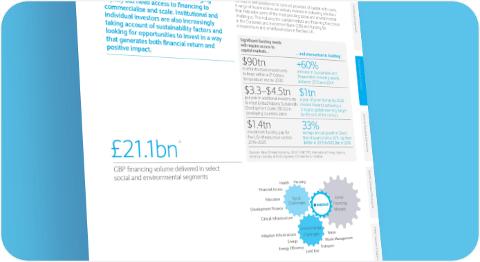 Access to financing New solutions to address global social and Barclays’ role Con t e environmental challenges are emerging Barclays is well-positioned to connect providers of capital with users. xt and Appr A range of business lines are actively involved in delivering solutions rapidly but need access to financing to that help solve some of the most pressing social and environmental challenges. This includes the capital markets and financing franchises o commercialise and scale. Institutional and in the Corporate and Investment Bank (CIB) and funding for ach individual investors are also increasingly entrepreneurs and small businesses in Barclays UK. taking account of sustainability factors and looking for opportunities to invest in a way Significant funding needs that generates both financial return and will require access to positive impact. capital markets… …and momentum is building Shar $90tn +60% ed Gr o in infrastructure investments increase in Sustainable and wth Ambition to keep within a 2º Celsius Responsible Investing assets temperature rise by 2030 between 2012 and 2014 $3.3–$4.5tn $1tn per year in additional investments a year of green bonds by 2020 to meet United Nations Sustainable needed towards achieving a Development Goals (SDGs) in 2 degree global warming target developing countries alone by the end of the century Gener al S $1.4tn 33% tandar investment funding gap for average annual growth in Green d Disclosur five US infrastructure sectors Bond issuance since 2011. Up from 2016–2025 $42bn in 2015 to $92.9bn in 2016 £ 21.1bn Sources: New Climate Economy, US SIF, UNCTAD, International Energy Agency, es American Society of Civil Engineers, Climate Bond Initiative GBP financing volume delivered in select social and environmental segments Specific S Housing Health tandar Financial Access Education Social Global d Disclosur Challenges Financing Development Finance Markets es Critical Infrastructure Environmental KP Adaption Infrastructure Challenges Water MG Assur Energy Waste Management Energy Efficiency Land Use Transport ance S ta t 2016 Progress Overview emen Focus areas Progress in 2016 2017 objectives t Deliver financing solutions ■■ Delivered £21.1bn of financing in select social and environmental ■■ Continue to deliver innovative segments financing solutions across ■■ Helped clients raise £1.5bn in Green Bonds and continued to grow business lines our Treasury Green Bond portfolio ■■ Launch additional Impact Series ■■ Developed High Growth Entrepreneur lending framework research ■■ Launched new Impact Series on key ESG topics ■■ Expand range of Impact ■■ Launched Impact Investing proposition Investing products and services ■■ Signed up to Principles for Responsible Investment ■■ Continue to grow Green Bond portfolio towards £2bn goal over time Note Within KPMG’s limited assurance scope. Please see page 49. home.barclays/annualreport Barclays PLC Environmental Social Governance Supplement 2016 • 07