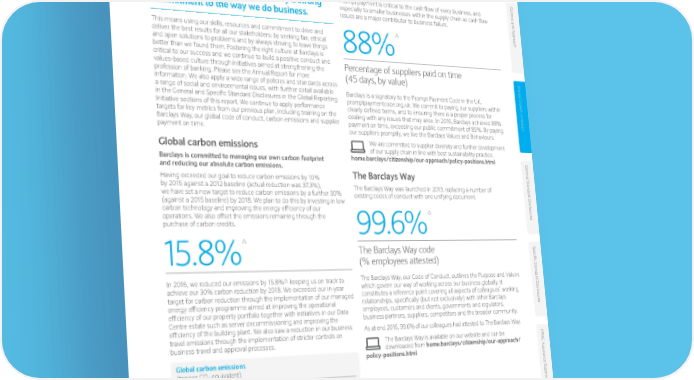 The way we do business Our ability to deliver Shared Growth for Prompt payment Con t e our stakeholders is underpinned by a strong Prompt payment is critical to the cash flow of every business, and xt and Appr especially to smaller businesses within the supply chain as cash flow commitment to the way we do business. issues are a major contributor to business failure. o This means using our skills, resources and commitment to drive and ach deliver the best results for all our stakeholders; by seeking fair, ethical and open solutions to problems and by always striving to leave things 88% better than we found them. Fostering the right culture at Barclays is critical to our success and we continue to build a positive conduct and Percentage of suppliers paid on time values-based culture through initiatives aimed at strengthening the profession of banking. Please see the Annual Report for more (45 days, by value) Shar information. We also apply a wide range of policies and standards across ed Gr a range of social and environmental issues, with further detail available o in the General and Specific Standard Disclosures in the Global Reporting Barclays is a signatory to the Prompt Payment Code in the UK, wth Ambition Initiative sections of this report. We continue to apply performance promptpaymentcode.org.uk. We commit to paying our suppliers within targets for key metrics from our previous plan, including training on the clearly defined terms, and to ensuring there is a proper process for Barclays Way, our global code of conduct, carbon emissions and supplier dealing with any issues that may arise. In 2016, Barclays achieved 88% payment on time. payment on time, exceeding our public commitment of 85%. By paying our suppliers promptly, we live the Barclays Values and Behaviours. Global carbon emissions We are committed to supplier diversity and further development of our supply chain in line with best sustainability practice. Barclays is committed to managing our own carbon footprint home.barclays/citizenship/our-approach/policy-positions.html Gener and reducing our absolute carbon emissions. The Barclays Way al S Having exceeded our goal to reduce carbon emissions by 10% tandar by 2015 against a 2012 baseline (actual reduction was 37.3%), The Barclays Way was launched in 2013, replacing a number of we have set a new target to reduce carbon emissions by a further 30% existing codes of conduct with one unifying document. d Disclosur (against a 2015 baseline) by 2018. We plan to do this by investing in low carbon technology and improving the energy efficiency of our operations. We also offset the emissions remaining through the es purchase of carbon credits. 99.6% 15 . 8 % The Barclays Way code Specific S (% employees attested) tandar The Barclays Way, our Code of Conduct, outlines the Purpose and Values In 2016, we reduced our emissions by 15.8% keeping us on track to which govern our way of working across our business globally. It d Disclosur achieve our 30% carbon reduction by 2018. We exceeded our in-year constitutes a reference point covering all aspects of colleagues’ working target for carbon reduction through the implementation of our managed relationships, specifically (but not exclusively) with other Barclays energy efficiency programme aimed at improving the operational employees, customers and clients, governments and regulators, es efficiency of our property portfolio together with initiatives in our Data business partners, suppliers, competitors and the broader community. Centre estate such as server decommissioning and improving the efficiency of the building plant. We also saw a reduction in our business As at end 2016, 99.6% of our colleagues had attested to The Barclays Way. travel emissions through the implementation of stricter controls on The Barclays Way is available on our website and can be KP business travel and approval processes. downloaded from home.barclays/citizenship/our-approach/ MG Assur Global carbon emissions policy-positions.html (tonnes CO2 equivalent) ance S ta t 2016 406,242 emen 2015 482,609 t We offset all our carbon emissions by investing in projects, such as the 1 Wildlife Works’ Kasigau Corridor REDD+ Project. The project, which became the world’s first REDD+ project to be validated and verified under the Verified Carbon Standard (VCS) and the Climate, Community and Biodiversity Standard (CCB), protects over 500,000 acres of highly threatened Kenyan forest known as the Kasigau Corridor, securing the wildlife migration corridor between Tsavo East and Tsavo West National Notes Parks. 1 Reducing Emissions from Deforestation and Degradation (REDD) was originated by the United Nations to help stop the destruction of the world’s forests. “REDD+” goes beyond avoiding deforestation to include the roles of wildlife conservation, community development and job creation, and enhancement of forest carbon stocks among other benefits. Within KPMG’s limited assurance scope. Please see page 49. home.barclays/annualreport Barclays PLC Environmental Social Governance Supplement 2016 • 15