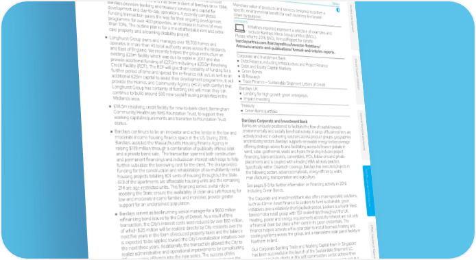 Specific Standard Disclosures Key Fully disclosed Social Partially disclosed Not disclosed Product portfolio* Indicator requirement Status Con ■■ t New homes plan for over 400 homes in central Manchester: e Mosscare, operating primarily in the Moss Side area of Manchester FS8* xt and Appr was incorporated in 1968 and has been a client of Barclays since 1984. Monetary value of products and services designed to deliver a Barclays provides banking and treasury services and capital for specific environmental benefit for each business line broken down by purpose. o development and day-to-day operations. A recently completed Omissions ach funding transaction paves the way for their ongoing development Initiatives reported represent a selection of examples and programme for over 400 properties, an increase in homes of more exclude Barclays Africa Group Limited (BAGL). than 10%. The outline plan is for a mix of affordable rent and extra Please refer to 2016 BAGL Annual Report for details: care property and a learning disability project. barclaysafrica.com/barclaysafrica/Investor-Relations/ ■■ Longhurst Group owns and manages over 18,700 homes and Announcements-and-publications/Annual-and-interim-reports.. operates in more than 45 local authority areas across the Midlands Shar and East of England. We recently helped the group restructure an Corporate and Investment Bank ed Gr existing £23m facility which was due to expire in 2017 and also ■■ Debt Finance, including Infrastructure and Project Finance o provide additional funding of £27.0m including a £25.0m Revolving ■■ Debt and Equity Capital Markets wth Ambition Credit Facility (RCF). The RCF will give them certainty of funding for a ■■ Green Bonds further period of time and spread the re-finance risk out, as well as an ■■ IB Research additional £25m capital to assist their development programme. It will ■■ Trade Finance – Sustainable Shipment Letters of Credit provide the Homes and Community Agency (HCA) with comfort that Barclays UK Longhurst Group has certainty of funding and will mean they can ■■ Lending for high growth green enterprises continue to build around 500 new social housing properties in the ■■ Impact Investing Midlands area. Treasury ■■ £18.5m revolving credit facility for new-to-bank client, Birmingham ■■ Green Bond portfolio Gener Community Healthcare NHS Foundation Trust, to support their working capital requirements and transition to Foundation Trust Barclays Corporate and Investment Bank al S status. Banks are uniquely positioned to facilitate the flow of capital towards tandar ■■ Barclays continues to be an innovator and active lender in the low and environmentally and socially beneficial activity. A range of business lines are d Disclosur moderate income housing finance space in the US. During 2016, actively involved in delivering solutions across product groups, geographies Barclays assisted the Massachusetts Housing Finance Agency in and industry sectors. Barclays supports renewable energy sector coverage raising $118 million through a combination of publically offered debt offering strategic advice to and facilitating access to finance globally in es and a private bond sale. The transaction spanned both construction wind, solar, geothermal, waste and hydro. Financing includes project and permanent financings and included an interest rate hedge to help financing, loans and bonds, convertibles, IPOs, follow-ons and private further subsidize the borrowing cost for the client. The deal provided placements and is coupled with a leading M&A advisory practice. Specifically within Cleantech coverage, Barclays has executed projects in funding for the construction and rehabilitation of six multifamily rental the following sectors: advanced materials, energy efficiency, water, Specific S housing projects totalling 801 units of housing throughout the State. manufacturing, transportation and agriculture. 613 of the apartments are affordable housing units and the remaining 214 are age-restricted units. This financing served a vital role in See pages 8-9 for further information on financing activity in 2016 tandar assisting the State ensure the availability of clean and safe housing for including Green Bonds. low and moderate income families and moreover, provide greater d Disclosur support for an underserved population. The Corporate and Investment Bank also offers more specialist solutions, such as £2m in Asset Finance to Lookers to fund sustainable green ■■ Barclays served as bookrunning senior manager for a $600 million initiatives over a relatively short payback period. Lookers is a North West es refinancing bond issued by the City of Detroit. As a result of this based motor retail group with 150 dealerships throughout the UK. transaction, the City’s interest costs were reduced by over $60 million, Heating, power and energy requirements across its network are not only of which $25 million will be realized directly by City residents over the a financial drain but place a firm dent in its green credentials. The next five years in the form of reduced property taxes and the balance finance helped activate a five-year plan to install biomass heating and KP is expected to be applied toward the City’s revitalization initiatives over cooling systems across the group, and a standalone solar panel facility in MG Assur the next three years. Additionally, the transaction allowed the City to Northern Ireland. realize administrative and operational improvements by consolidating 35 prior series of bonds into the new series. The success of this Our Corporate Banking Trade and Working Capital team in Singapore ance S has been successful in the launch of the Sustainable Shipment LC, transaction was the direct result of close coordination between the ta designed to help clients in the soft commodities sector achieve their t City of Detroit, Michigan’s Department of Treasury and Barcl