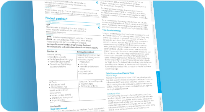 Specific Standard Disclosures Key Fully disclosed Social Partially disclosed Not disclosed Compliance Family Springboard Mortgage Con At Barclays we know how important it is for people to buy their own t e Indicator requirement Status home, so in January 2013 we launched the Family Springboard xt and Appr G4-PR9 mortgage, responding to the significant burden high deposits placed on Monetary value of significant fines for non-compliance first time buyers and their parents. with laws and regulations concerning the provision and o use of products and services. The Family Springboard mortgage allows home buyers to secure a ach mortgage with the help from family or friends (helper), while allowing Disclosure the helper to earn interest at the same time. It is available for first time Please see Note 29 to the Financial Statements contained in our Annual buyers and home movers, moving up the property ladder, for loans of up Report 2016 which outlines our legal, competition and regulatory matters. to £500k. The borrower takes out the mortgage, while the helper puts 10% of the Product portfolio* purchase price into a Helpful Start Account – earning an attractive rate of Shar Indicator requirement Status interest. As long as the borrower keeps up their repayments, the helper ed Gr gets their money back with interest (Bank of England base rate + 1.5%). FS7* o Monetary value of products and services designed to Voice Security technology wth Ambition deliver a specific social benefit for each business line In August 2016 Barclays launched Voice Security technology to Personal broken down by purpose. and Premier customers. This technology verifies customers based solely Omissions on their voice, making it a highly secure method of verification. The Initiatives reported represent a selection of examples service is free and makes it easier for telephone banking customers to and exclude Barclays Africa Group Limited (BAGL). access their account, especially those who struggle to remember Please refer to 2016 BAGL Annual Report for details: passwords and may unwittingly make their accounts vulnerable by barclaysafrica.com/barclaysafrica/Investor-Relations/ writing them down. During a natural conversation with a Personal Announcements-and-publications/Annual-and-interim-reports. Banker we start to collect the customer’s voice print, once we have Gener Barclays UK Barclays International created the voice print the customer can register for Voice Security. Each al S Personal Banking Corporate and Investment Bank time a customer calls, the technology will compare their voice against tandar the voice print to establish if it matches, enabling customers to be ■■ Basic Bank Accounts supports the following sectors: quickly verified and gain access to their account. In 2013 Barclays was d Disclosur ■■ Family Springboard Mortgage ■■ social housing and the first European bank to launch this ground-breaking technology to ■■ Home Pathway Insurance infrastructure our Wealth clients. The feedback, both internally and externally, has been ■■ Financial and Digital Wings ■■ education incredibly positive. Following on from this successful deployment the es education platforms ■■ renewable and alternative functionality has now been rolled out to both our Personal and Premier energy customers groups. ■■ supranationals ■■ US municipalities Digital, Community and Financial Wings Specific S Financial Wings Financial Wings was launched in June 2016. It is an educational online UK Cards Consumer, Cards and Payments tool which builds the financial knowledge and confidence of customers, tandar ■■ Barclaycard Initial ■■ Anywhere, Bpay colleagues and all financial service consumers. It provides access to d Disclosur ■■ Money Worries Hub ■■ FICO service In the US industry-leading information and guidance, partnered with interactive Wealth and Investment content. This dual approach allows users to both learn, and apply their Management learning, in a safe environment. es ■■ Instant Lending for SME Community Wings ■■ Charity Fund Management Community Wings (formerly the Community Driving Licence) was ■■ Impact Investing launched in January 2014. It is an interactive learning tool that enables KP colleagues to live in our customers’ world, providing colleagues with MG Assur Barclays UK insight, skills and tools to better serve our customers, strengthen their Basic bank account relationships within their local communities. We have over 19,000 In December 2015, we launched our new Basic Current Account which colleagues using Community wings and launched new modules during ance S meets HM Treasury’s Memorandum of Understanding (MoU) on basic 2016 on critical and long term illness and on fraud and scams. ta t bank accounts. These financial inclusion accounts are available to emen anyone who does not already have a bank account or who is not eligible for a standard account. They provide over-the-counter services, access t to the ATM network and digital and telephone banking. They also offer free text alerts to help customers manage their money and stay in control of their finances. Over half a million customers are on the Barclays Basic Current Account. Note * Financial Services Sector Disclosures document home.barclays/annualreport Barclays PLC Environmental Social Governance Supplement 2016 • 44
