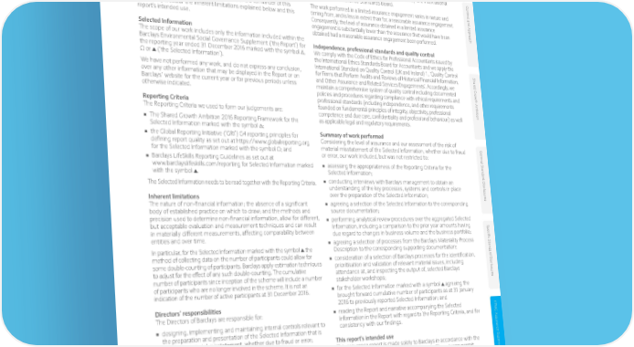 KPMG Assurance Statement Independent Limited Assurance Report to Barclays PLC KPMG LLP (‘KPMG’ or ‘we’) were engaged by Barclays Bank PLC to provide Assurance standards applied limited assurance to Barclays PLC (‘Barclays’) over the Selected Information We performed our work in accordance with International Standard on described below for the reporting year ended 31 December 2016. Assurance Engagements 3000 – ‘Assurance Engagements other than Audits or Reviews of Historical Financial Information’ (‘ISAE 3000’) and, Our conclusion in respect of the greenhouse gas emissions information included within Based on the work we have performed and the evidence we have the Selected Information, in accordance with International Standard on obtained, nothing has come to our attention that causes us to believe Assurance Engagements 3410 - ‘Assurance Engagements on that the Selected Information has not been properly prepared, in all Greenhouse Gas Statements’ (‘ISAE 3410’), issued by the International Con material respects, in accordance with the Reporting Criteria. Auditing and Assurance Standards Board. t e This conclusion is to be read in the context of the remainder of this The work performed in a limited assurance engagement varies in nature and xt and Appr report, in particular the inherent limitations explained below and this timing from, and is less in extent than for, a reasonable assurance engagement. report’s intended use. Consequently, the level of assurance obtained in a limited assurance o engagement is substantially lower than the assurance that would have been ach Selected Information obtained had a reasonable assurance engagement been performed. The scope of our work includes only the information included within the Barclays Environmental Social Governance Supplement (‘the Report’) for Independence, professional standards and quality control the reporting year ended 31 December 2016 marked with the symbol ∆, We comply with the Code of Ethics for Professional Accountants issued by Ω or (‘the Selected Information’). the International Ethics Standards Board for Accountants and we apply the We have not performed any work, and do not express any conclusion, International Standard on Quality Control (UK and Ireland) 1, ‘Quality Control Shar for Firms that Perform Audits and Reviews of Historical Financial Information, over any other information that may be displayed in the Report or on and Other Assurance and Related Services Engagements’. Accordingly, we ed Gr Barclays’ website for the current year or for previous periods unless o otherwise indicated. maintain a comprehensive system of quality control including documented wth Ambition policies and procedures regarding compliance with ethical requirements and Reporting Criteria professional standards (including independence, and other requirements The Reporting Criteria we used to form our judgements are: founded on fundamental principles of integrity, objectivity, professional competence and due care, confidentiality and professional behaviour) as well ■■ The Shared Growth Ambition 2016 Reporting Framework for the as applicable legal and regulatory requirements. Selected Information marked with the symbol ; ■■ the Global Reporting Initiative (‘GRI’) G4 reporting principles for Summary of work performed defining report quality as set out at https://www.globalreporting.org Considering the level of assurance and our assessment of the risk of for the Selected Information marked with the symbol Ω; and material misstatement of the Selected Information, whether due to fraud Gener or error, our work included, but was not restricted to: ■■ Barclays LifeSkills Reporting Guidelines as set out at al S www.barclayslifeskills.com/reporting for Selected Information marked ■■ assessing the appropriateness of the Reporting Criteria for the tandar with the symbol . Selected Information; d Disclosur The Selected Information needs to be read together with the Reporting Criteria. ■■ conducting interviews with Barclays management to obtain an understanding of the key processes, systems and controls in place Inherent limitations over the preparation of the Selected Information; es The nature of non-financial information; the absence of a significant ■■ agreeing a selection of the Selected Information to the corresponding body of established practice on which to draw; and the methods and source documentation; precision used to determine non-financial information, allow for different, ■■ performing analytical review procedures over the aggregated Selected but acceptable evaluation and measurement techniques and can result Information, including a comparison to the prior year amounts having Specific S in materially different measurements, affecting comparability between due regard to changes in business volume and the business portfolio; entities and over time. ■■ agreeing a selection of processes from the Barclays Materiality Process In particular, for the Selected Information marked with the symbol the Description to the corresponding supporting documentation; tandar method of collecting data on the number of participants could allow for ■■ consideration of a selection of Barclays processes for the identification, d Disclosur some double-counting of participants. Barclays apply estimation techniques prioritisation and validation of relevant material issues, including to adjust for the effect of any such double-counting. The cumulative attendance at, and inspecting the output of, selected Barclays number of participants since inception of the scheme will include a number stakeholder workshops; es of participants who are no longer involved in the scheme. It is not an indication of the number of active participants at 31 December 2016. ■■ for the Selected Information marked with a symbol agreeing the brought forward cumulative number of participants as at 31 January Directo