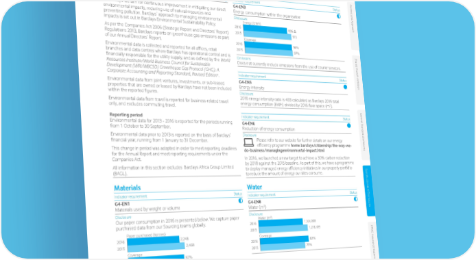 Specific Standard Disclosures Key Fully disclosed Environmental Partially disclosed Not disclosed Indicator requirement Status Energy Con t e G4-DMA Indicator requirement Status xt and Appr Disclosure G4-EN3 At Barclays we aim for continuous improvement in mitigating our direct Energy consumption within the organisation environmental impacts, reducing use of natural resources and o preventing pollution. Barclays’ approach to managing environmental Disclosure ach Energy (GWh) impacts is set out in Barclays Environmental Sustainability Policy. 2016 836 As per the Companies Act 2006 (Strategic Report and Directors’ Report) 2015 913 Regulations 2013, Barclays reports on greenhouse gas emissions as part Coverage of our Annual Directors’ Report. 2016 96% Environmental data is collected and reported for all offices, retail 2015 97% Shar branches and data centres where Barclays has operational control and is Omissions ed Gr financially responsible for the utility supply, and as defined by the World Does not currently include emissions from the use of courier services. o Resources Institute/World Business Council for Sustainable wth Ambition Development (WRI/WBCSD) Greenhouse Gas Protocol (GHG): A Corporate Accounting and Reporting Standard, Revised Editiona. Indicator requirement Status Environmental data from joint ventures, investments, or sub-leased G4-EN5 properties that are owned or leased by Barclays have not been included Energy intensity within the reported figures. Disclosure Environmental data from travel is reported for business-related travel 2016 energy intensity ratio is 433 calculated as Barclays 2016 total 2 only, and excludes commuting travel. energy consumption (kWh) divided by 2016 floor space (m ). Gener Reporting period Indicator requirement Status al S Environmental data for 2013 - 2016 is reported for the periods running G4-EN6 tandar from 1 October to 30 September. Reduction of energy consumption Environmental data prior to 2013 is reported on the basis of Barclays’ Disclosure d Disclosur financial year, running from 1 January to 31 December. Please refer to our website for further details on our energy efficiency programme home.barclays/citizenship/the-way-we- This change in period was adopted in order to meet reporting deadlines do-business/managingenvironmental-impact.html es for the Annual Report and meet reporting requirements under the Companies Act. In 2016, we launched a new target to achieve a 30% carbon reduction All information in this section excludes Barclays Africa Group Limited by 2018 against the 2015 baseline. As part of this, we have a programme (BAGL). to deploy managed energy efficiency initiatives in our property portfolio Specific S to reduce the amount of energy our sites consume. Materials Water tandar Indicator requirement Status Indicator requirement Status d Disclosur G4-EN1 G4-EN8 Materials used by weight or volume 3 Disclosure Water (m ) es Disclosure Our paper consumption in 2016 is presented below. We capture paper 3 Water (m ) purchased data from our Sourcing teams globally. 16 1,104,399 20 Paper purchased (tonnes) 2015 1,218,109 KP 2016 2,248 Coverage MG Assur 2015 2,468 2016 82% 16 Coverage 82% 2015 75% ance S 20 84% ta 2015 t emen t Note a www.ghgprotocol.org home.barclays/annualreport Barclays PLC Environmental Social Governance Supplement 2016 • 35