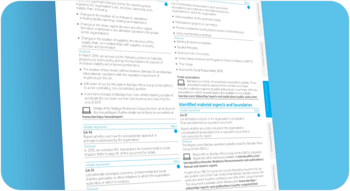General Standard Disclosures Key Fully disclosed Partially disclosed Not disclosed Organisational profile Indicator requirement Status Con t e Indicator requirement Status G4-16 xt and Appr G4-13 List memberships of associations (such as industry Report any significant changes during the reporting period associations) and national or international advocacy organisations in which the organisation: regarding the organisation’s size, structure, ownership or its o supply chain, including: ach ■■ Holds a position on the governance body ■■ Changes in the location of, or changes in, operations, ■■ Participates in projects or committees including facility openings, closings and expansions ■■ Provides substantive funding beyond routine membership dues ■■ Changes in the share capital structure and other capital formation, maintenance and alteration operations (for private ■■ Views membership as strategic sector organisations) Disclosure Shar ■■ Changes in the location of suppliers, the structure of the ■■ Banking Environment Initiative ed Gr supply chain, or in relationships with suppliers, including ■■ Equator Principles o selection and termination wth Ambition ■■ Business in the Community Disclosure In March 2016, we announced the following actions to materially ■■ United Nations Environment Programme Finance Initiative (UNEP FI) progress our restructuring and lay the foundations for a period of ■■ Thun Group increased stability and improved performance. ■■ Business for Social Responsibility (BSR) ■■ The creation of two clearly defined divisions, Barclays UK and Barclays International, consistent with the regulatory requirement of Trade associations ringfencing in the UK. Barclays is a member of several trade associations globally. These Gener ■■ associations work to represent their members and shape Sell-down of our 62.3% stake in Barclays Africa Group Limited (BAGL) industry’s collective response to public policy issues. A summary of the key al S to a non-controlling, non-consolidated, position. associations in which we participate is also available on our website – tandar ■■ A one-time increase to Barclays Non-Core, whilst retaining our plan to barclays.com/citizenship/reports-and-publications/public-policy.html accelerate the run down our Non-Core business and close it by the d Disclosur end of 2017. Identified material aspects and boundaries Details of the Strategic Review and Group structure can be found in Indicator requirement Status es the Annual Report. Further details can be found on our website at G4-17 home.barclays/annualreport List all entities included in the organisation’s consolidated financial statements or equivalent documents. Indicator requirement Status Report whether any entity included in the organisation’s Specific G4-14 consolidated financial statements or equivalent documents is S Report whether and how the precautionary approach or not covered by the report. tandar principle is addressed by the organisation. Disclosure d Disclosure This Report covers Barclays operations globally except for Barclays Africa Disclosur In 2016, we reviewed 410 transactions for environmental or social Group Limited (BAGL). impacts. Refer to page 41 of this document for details. Please refer to Barclays Africa Group Limited (BAGL) Integrated es Indicator requirement Status Report and other disclosures available at barclaysafrica.com/ barclaysafrica/Investor-Relations/Announcements-and-publications/ G4-15 Annual-and-interim-reports List externally developed economic, environmental and social KP charters, principles, or other initiatives to which the organisation As part of our CRD IV Country by Country Reporting requirements, we MG Assur subscribes or which it endorses. also publish a list of the main entities that Barclays operates around the world and which together contribute over 90% of the Group’s turnover. Disclosure This document is available at the following link home.barclays/ ance S ■■ Equator Principles citizenship/reports-and-publications/country-snapshot.html ta t ■■ Green Bond Principles emen ■■ United Nations Environment Programme Finance Initiative (UNEP FI) t ■■ Wolfsburg Principles ■■ Soft Commodities Compact (Banking Environment Initiative and Consumer Goods Forum) ■■ Living Wage (UK) ■■ New York Declaration on Forests (2014) ■■ The Paris Pledge for Action (2015) ■■ UN Principles for Responsible Investment (The Barclays UK Retirement fund and Barclays Asset Management Ltd are signatories) home.barclays/annualreport Barclays PLC Environmental Social Governance Supplement 2016 • 20
