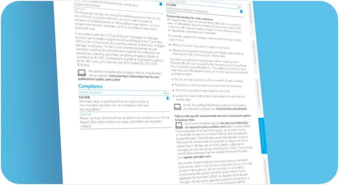 Specific Standard Disclosures Key Fully disclosed Social Partially disclosed Not disclosed Public policy Product responsibility Con t e Indicator requirement Status Indicator requirement Status xt and Appr G4-SO6 G4-DMA Total value of political contributions by country and Disclosures on management approach. recipient/beneficiary. o Disclosure ach Disclosure Responsible lending for retail customers The Group did not give any money for political purposes in the UK, the We support retail customers who are facing difficulties in a number of rest of the EU or outside of the EU, nor did it make any political ways. An affordability assessment takes into account the nature of the donations to political parties or other political organisations, or to any customer’s difficulties and ability to repay, to ensure that any solutions independent election candidates, or incur any political expenditure are appropriate, responsible and sustainable. during the year. For example, support for mortgage customers who meet our criteria Shar In accordance with the US Federal Election Campaign Act, Barclays could include: provides administrative support to a federal Political Action Committee ed Gr ■■ Offering short-term reductions in repayment amounts o (PAC) in the US funded by the voluntary political contributions of eligible wth Ambition Barclays’ employees. The PAC is not controlled by Barclays and all ■■ Allowing the longer-term restructuring of mortgage loans, either by decisions regarding the amounts and recipients of contributions are extending the term or reducing the interest rates. directed by a steering committee comprising employees eligible to Our teams are trained to recognise signs where customers are in contribute to the PAC. Contributions to political organisations reported financial difficulty, such as unauthorised borrowing, incurring significant by the PAC during the calendar year 2016 totalled $12,500 (2015: fees or persistent overdraft balances. This enables us to intervene at an $79,500). early stage and offer proactive advice on the best way to get out of debt We disclose on public policy engagements on a regular basis and back on track. via our website. home.barclays/citizenship/reports-and- In the UK, we help customers do this in a variety of ways, including: Gener publications/public-policy.html ■■ Reductions in minimum payment requirements for credit cards al S Compliance tandar ■■ Short-term reductions in loan repayment amounts Indicator requirement Status ■■ Longer-term plans that combine lower repayments with reduced d Disclosur G4-SO8 interest rates. Monetary value of significant fines and total number of non-monetary sanctions for non-compliance with laws See the Annual Report Risk Review section for more detail on es and regulations. our forbearance programmes: home.barclays/annualreport Disclosure Policies with specific environmental and social components applied Please see Note 29 to the Financial Statements contained in our Annual Report 2016 which outlines our legal, competition and regulatory to business lines Specific S matters. Our Environmental Risk Standard barclays.com/citizenship/ our-approach/policy-positions.html applies to project related finance proposals for an asset that may give rise to environmental tandar or social risks. It is also the mechanism through which we apply the Equator Principles. These Principles are an internationally recognised d Disclosur framework for environmental and social risk due diligence in project related finance. Barclays was one of four banks to collaborate on developing the principles ahead of their launch in 2003. There are today es over 85 banks worldwide that have adopted the Equator Principles (see equator-principles.com). We consider environmental and social issues to be a mainstream KP business risk, which is why they are incorporated into our core credit MG Assur decision-making process. We are committed to undertaking environmental risk assessments of any project related finance application for more than US$10m, as stipulated by the Equator ance S Principles. We also review applications below this threshold on a ta t case-by-case basis. We have a dedicated Environmental Risk emen Management (ERM) team as a part of our Head Office Credit Risk function, together with further ERM resource in the Credit Risk function t in South Africa. In 2016, there were 410 transactions (2015: 374) reviewed in the central team, of which six were subject to scrutiny against the Equator Principles’ due diligence framework. Rigorous adherence to the provisions of the Equator Principles ensures that Barclays would only proceed with such transactions if potentially adverse environmental and impacts are appropriately mitigated. home.barclays/annualreport Barclays PLC Environmental Social Governance Supplement 2016 • 41