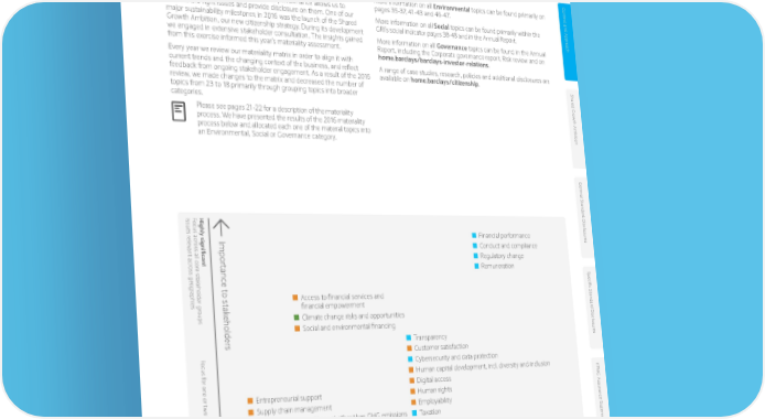 About this report Report navigation Con t e Focusing on specific topics that are important to our stakeholders and More information on all Environmental topics can be found primarily on xt and Appr strategically significant to our business performance allows us to pages 35-37, 41-43 and 46-47. address the right issues and provide disclosure on them. One of our More information on all Social topics can be found primarily within the major sustainability milestones in 2016 was the launch of the Shared o Growth Ambition, our new citizenship strategy. During its development GRI’s social indicator pages 38-48 and in the Annual Report. ach we engaged in extensive stakeholder consultation. The insights gained More information on all Governance topics can be found in the Annual from this exercise informed this year’s materiality assessment. Report, including the Corporate governance report, Risk review and on Every year we review our materiality matrix in order to align it with home.barclays/barclays-investor-relations. current trends and the changing context of the business, and reflect A range of case studies, research, policies and additional disclosures are feedback from ongoing stakeholder engagement. As a result of the 2016 available on home.barclays/citizenship. review, we made changes to the matrix and decreased the number of Shar topics from 23 to 18 primarily through grouping topics into broader ed Gr categories. o Please see pages 21-22 for a description of the materiality wth Ambition process. We have presented the results of the 2016 materiality process below and allocated each one of the material topics into an Environmental, Social or Governance category. Gener al S tandar d Disclosur Issues rFHighly significant ocus acr Financial performance es eleoss all cImportance t v an Conduct and compliance t acr Regulatory change oss geogror e stak Remuneration Specific S eholder gr aphies o stak Access to financial services and tandar oups eholders financial empowerment d Disclosur Climate change risks and opportunities Social and environmental financing Transparency es Customer satisfaction F ocus f Cybersecurity and data protection or one or tw Human capital development, incl. diversity and inclusion KP Digital access MG Assur Entrepreneurial support Human rights o k Supply chain management Employability ance S e y stak Direct environmental impact other than GHG emissions Taxation ta t eholder gr emen Significant t oups Importance to Barclays Significant Highly significant Relevant for specific business activities Group-wide significance Strategic relevance for long-term performance Key: Environmental Social Governance, incl. economic impact (refer to Annual Report and our website) home.barclays/annualreport Barclays PLC Environmental Social Governance Supplement 2016 • 03