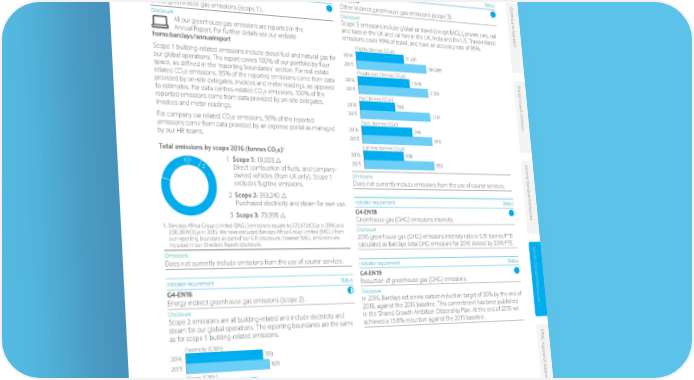 Specific Standard Disclosures Key Fully disclosed Environmental Partially disclosed Not disclosed Emissions Indicator requirement Status Con t e Indicator requirement Status G4-EN17 xt and Appr G4-EN15 Other indirect greenhouse gas emissions (scope 3). Direct greenhouse gas emissions (scope 1). Disclosure Scope 3 emissions include global air travel (except BAGL), private cars, rail o Disclosure and taxis in the UK and car hire in the UK, India and the US. Travel-related ach All our greenhouse gas emissions are reported in the emissions cover 99% of travel, and have an accuracy rate of 95%. Annual Report. For further details see our website home.barclays/annualreport Flights (tonnes CO e) 2 Scope 1 building-related emissions include diesel fuel and natural gas for 2016 71,071 our global operations. The report covers 100% of our portfolio by floor 2015 104,389 Private cars (tonnes CO e) Shar space, as defined in the ‘reporting boundaries’ section. For real estate 2 related CO e emissions, 95% of the reported emissions come from data 2016 1,549 2 2015 2,103 ed Gr provided by on-site delegates, invoices and meter readings, as opposed o to estimates. For data centres-related CO e emissions, 100% of the wth Ambition 2 Rail (tonnes CO e) reported emissions come from data provided by on-site delegates, 2 2016 595 invoices and meter readings. 2015 1,191 For company car related CO e emissions, 90% of the reported Taxis (tonnes CO e) 2 2 emissions come from data provided by an expense portal as managed 2016 246 by our HR teams. 2015 343 Car hire (tonnes CO e) Total emissions by scope 2016 (tonnes CO e)1 2 2 2016 538 3 1 1 Scope 1: 19,003 2015 955 Gener 2 Direct combustion of fuels, and company- owned vehicles (from UK only). Scope 1 Omissions al S excludes fugitive emissions. Does not currently include emissions from the use of courier services. tandar 2 Scope 2: 313,240 d Disclosur Purchased electricity and steam for own use. Indicator requirement Status G4-EN18 3 Scope 3: 73,998 Greenhouse gas (GHG) emissions intensity. es 1. Bar clays Africa Group Limited (BAGL) emissions equate to 272,172tCO e in 2016 and 2 Disclosure 230,307tCO e in 2015. We have excluded Barclays Africa Group Limited (BAGL) from 2 2016 greenhouse gas (GHG) emissions intensity ratio is 5.31 tonnes/FTE our reporting boundary as part of our GRI disclosure, however BAGL emissions are included in our Directors Report disclosure. calculated as Barclays total GHG emissions for 2016 divided by 2016 FTE. Omissions Specific S Does not currently include emissions from the use of courier services. Indicator requirement Status G4-EN19 tandar Indicator requirement Status Reduction of greenhouse gas (GHG) emissions. d Disclosur G4-EN16 Disclosure Energy indirect greenhouse gas emissions (scope 2). In 2016, Barclays set a new carbon reduction target of 30% by the end of Disclosure 2018, against the 2015 baseline. This commitment has been published es Scope 2 emissions are all building-related and include electricity and in the Shared Growth Ambition Citizenship Plan. At the end of 2016 we steam for our global operations. The reporting boundaries are the same achieved a 15.8% reduction against the 2015 baseline. as for scope 1 building-related emissions. Electricity (GWh) KP 2016 759 MG Assur 2015 823 Steam (GWh) ance S 20 16 7 ta t 2015 8 emen t home.barclays/annualreport Barclays PLC Environmental Social Governance Supplement 2016 • 36