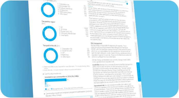 Specific Standard Disclosures Key Fully disclosed Economic Partially disclosed Not disclosed Economic performance Indicator requirement Status Con t 1 e ■■ Overview of tax paid by type and region 2016 G4-EC2 xt and Appr Financial implications and other risks and opportunities for the Tax paid globally (£m) organisation’s activities due to climate change Disclosure o 6 1 1 Corporation tax 701 Climate change, with its risks and financial implications, is a critical issue ach 5 2 Irrecoverable VAT 636 that must be addressed. Understanding those risks, as well as the 3 Employer payroll tax 611 opportunities, through increased disclosure and transparency is 4 UK Bank levy 391 necessary for all market participants to make informed and efficient 4 2 5 Withholding taxes 383 capital allocation decisions. 6 Other taxes 102 There has been significant activity to further the financial sector’s 3 understanding of the potential financial, operational and strategic Shar implications of climate change during 2016. Barclays remains a ed Gr Tax paid by region participant in the Task Force on Climate Related Financial Disclosures o (£m) (TCFD), established under the auspices of the Financial Stability Board wth Ambition 1 1 UK 1,463 (FSB). We are supportive of the work done by the TCFD and will 5 2 Americas 290 continue to engage with this and other initiatives. The principles laid out 4 3 Europe (excl. UK) 512 in the Task Force’s Recommendations are an important step in providing 4 Africa and Middle East 426 the foundations from which companies, investors, banks and other 5 Asia Pacific 133 market participants can move forward together to improve transparency 3 and build better understanding of those potential climate-related risks and opportunities. 2 Risk management Gener Barclays Board is responsible for approving risk appetite. This is al S Tax paid in the UK (£m) determined through the Enterprise Risk Management Framework tandar 1 Corporation tax 121 (ERMF) with Principal Risks managed through a framework and policy 5 1 2 2 d Disclosur 2 Social Security 374 which set out responsibilities for risk management. Business risks are 3 VAT 497 split into eight categories: credit; market; funding; operational; conduct, 4 Bank levy 391 reputation, legal and model risk. Please see the Risk Review within the es 4 5 Other taxes 80 2016 Annual Report for more information. 3 Climate change considerations are currently managed mainly within credit, operational and reputation risk. Credit Risk: Barclays has a dedicated Environmental Risk Management Specific S 1. Please see 2016 Country Snapshot for more information. This includes Barclays Africa (ERM) team in place to advise on client transactions that have Group. 2. Social Security – includes employer national insurance contributions. associated environmental or climate related risks. This team reports tandar directly to the Managing Director, Group Credit Risk; and high risk ■■ Community investment transactions are referred to the Risk Chief Credit Officer (or individual d Disclosur Invested in our communities in 2016 (%): £48m business divisions’ committees) for consideration. There is regular dialogue between the ERM and credit managers on environmental risk 83 management issues to raise awareness and ensure protocol is followed. es 5 Please see pages 41-42 of this Report for further detail on policies and 12 standards applied for key industry sectors and transaction types. Operational risk: Key risk indicators that affect the resilience and Cash Management cost Volunteer work time contribution continuous operation of the business are identified, especially for key KP business locations. These include, amongst others, regulatory risks and MG Assur ■■ Community investment employee programme participation (excludes extreme weather events. Premises risk management processes cover Barclays Africa Group). risks and opportunities associated with regulatory risks and extreme ance S Metric 2016 weather events. Business continuity management processes also include ta assessment of natural hazards associated with climate change and the t Total unique colleagues participating in Barclays’ 43,000 impact of these on location selection as well as development of emen volunteering, fundraising or giving programmes contingency plans. Location risk assessments also include climate t Total number of volunteering hours 212,000 change risks where relevant. Total number of colleagues volunteering their time and 23,000 expertise Percentage of volunteering interactions leveraging 51% colleagues’ skills Total amount raised and matched through fundraising £25m home.barclays/annualreport Barclays PLC Environmental Social Governance Supplement 2016 • 32