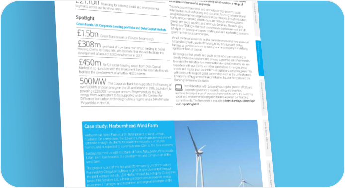 Access to financing 2016 Progress overview In the first year of our new Shared Growth Ambition, Barclays helped Con clients raise capital or provided lending facilities across a range of t e Barclays delivered social and environmental segments. xt and Appr £21.1bn financing for selected social and environmental This includes environmental and renewable energy projects; social infrastructure such as housing and education, financing to supranational o segments across our business lines. and global development organisations whose missions, through education, ach health, environment and infrastructure, are rooted in shared economic growth and social equality; and lending to Small and Medium-sized Spotlight Enterprises (SMEs) in the most economically deprived areas of the UK, Green Bonds, UK Corporate Lending portfolio and Debt Capital Markets to help them develop and grow, creating jobs and accelerating economic growth in their local communities. We will continue to execute on this commitment to drive new sources of Shar £1.5bn Green Bond issuance (Source: Bloomberg). sustainable growth, provide financing to key solutions and enable ed Gr Barclays to generate returns by acting as an intermediary in mobilising o £308m provided of new (and mandated) lending to Social significant flows of capital. wth Ambition Housing clients by Corporate. We estimate that this will facilitate the We recognise that private and public sector actors are continuing to development of around 3,000 new homes in 2017. identify innovative solutions and develop supportive policy frameworks to enable the transition to a more sustainable global economy. We aim £450m for UK social housing raised from Debt Capital to partner with our clients and other stakeholders to navigate these Markets in conjunction with the Investment Bank. We estimate this will trends and deploy both our intellectual capital and convening power. We facilitate the development of a further 4,500 homes. will continue to support global partnerships such as the United Nations Environment Programme Finance Initiative, Equator Principles and the Banking Environment Initiative Gener 500MW The Corporate Bank has supported the financing of In collaboration with Sustainalytics, a global provider of ESG and al S over 500MW of clean energy in the UK and Ireland in 2016, equivalent to corporate governance research, ratings and analytics, tandar powering c220,000 homes per annum. Projects include the first we have developed a use of proceeds framework to define the qualifying energy-from-waste plant to be supported under the Contract for social and environmental categories tracked as part of our financing d Disclosur Difference low carbon technology subsidy regime and a 344MW solar commitments. The framework is available at home.barclays/citizenship/ PV portfolio in the UK. our-reporting.html. es Case study: Harburnhead Wind Farm Specific S Harburnhead Wind Farm is a 51.7MW project in West Lothian, tandar Scotland. On completion, the 22-wind turbine Harburnhead site will generate enough electricity to power the equivalent of 31,000 d Disclosur homes, and is expected to contribute over £3m to the local economy. Barclays teamed up with the Bank of Tokyo Mitsubishi UFJ to provide es £70m term loan towards the development and construction of the wind farm. The project is one of the last projects remaining under the current Renewables Obligation subsidy regime. It is implemented through KP the joint venture vehicle, LDV Harburnhead Ltd, set up by Oxfordshire MG Assur based FIM Services Ltd, a leading independent renewable energy investment manager, and its partner and original developer of the ance S site, LDV Enel Viento. ta t Dr Wayne Cranstone, FIM’s Chief Operating Officer said, “We are emen delighted to have secured project finance through two experienced lenders such as Barclays and MUFG. It is great to be working with t both banks again and I look forward to seeing this exciting project enter the operational phase towards the end of the year”. Nial Gemmell, Director, Infrastructure and Project Finance at Barclays, said, “Harburnhead marks another significant step in developing the UK’s wind power capabilities. Working alongside FIM Services and LDV Enel Viento further demonstrates our continued commitment to the renewable energy sector where we have a strong track record in supporting quality projects.” home.barclays/annualreport Barclays PLC Environmental Social Governance Supplement 2016 • 08