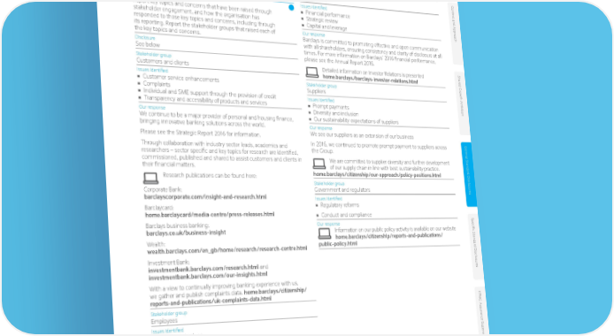 General Standard Disclosures Key Fully disclosed Partially disclosed Not disclosed Stakeholder engagement Stakeholder group Con t Shareholders e Indicator requirement Status Issues identified xt and Appr G4-27 Report key topics and concerns that have been raised through ■■ Financial performance ■■ Strategic review stakeholder engagement, and how the organisation has o responded to those key topics and concerns, including through ■■ Capital and leverage ach its reporting. Report the stakeholder groups that raised each of Our response the key topics and concerns. Barclays is committed to promoting effective and open communication Disclosure with all shareholders, ensuring consistency and clarity of disclosure at all See below times. For more information on Barclays’ 2016 financial performance, please see the Annual Report 2016. Stakeholder group Detailed information on Investor Relations is presented Shar Customers and clients Issues identified home.barclays/barclays-investor-relations.html ed Gr o ■■ Customer service enhancements Stakeholder group wth Ambition ■■ Complaints Suppliers ■■ Individual and SME support through the provision of credit Issues identified ■■ Transparency and accessibility of products and services ■■ Prompt payments Our response ■■ Diversity and inclusion We continue to be a major provider of personal and housing finance, ■■ Our sustainability expectations of suppliers bringing innovative banking solutions across the world. Our response Please see the Strategic Report 2016 for information. We see our suppliers as an extension of our business Through collaboration with industry sector leads, academics and In 2016, we continued to promote prompt payment to suppliers across Gener researchers – sector specific and key topics for research are identified, the Group. al S commissioned, published and shared to assist customers and clients in We are committed to supplier diversity and further development tandar their financial matters. of our supply chain in line with best sustainability practice. Research publications can be found here: home.barclays/citizenship/our-approach/policy-positions.html d Disclosur Stakeholder group Corporate Bank: Government and regulators es barclayscorporate.com/insight-and-research.html Issues identified Barclaycard: ■■ Regulatory reforms home.barclaycard/media-centre/press-releases.html ■■ Conduct and compliance Barclays business banking: Our response Specific barclays.co.uk/business-insight Information on our public policy activity is available on our website S Wealth: home.barclays/citizenship/reports-and-publications/ tandar public-policy.html wealth.barclays.com/en_gb/home/research/research-centre.html d Investment Bank: Disclosur investmentbank.barclays.com/research.html and investmentbank.barclays.com/our-insights.html es With a view to continually improving banking experience with us, we gather and publish complaints data. home.barclays/citizenship/ reports-and-publications/uk-complaints-data.html KP Stakeholder group MG Assur Employees Issues identified ance S ■■ Culture and values ■■ Diversity and inclusion ta t ■■ Training and development emen Our response t Our colleagues form the core of our business. We are committed to investing in them and ensuring they are fully engaged. We conduct a global employee opinion survey Your View. Further details can be found on our website at home.barclays/ annualreport. In 2016, we continued our efforts to increase the proportion of women in senior roles home.barclays/citizenship.html. Robust training and development initiatives allow us to recruit and retain top talent. home.barclays/annualreport Barclays PLC Environmental Social Governance Supplement 2016 • 24
