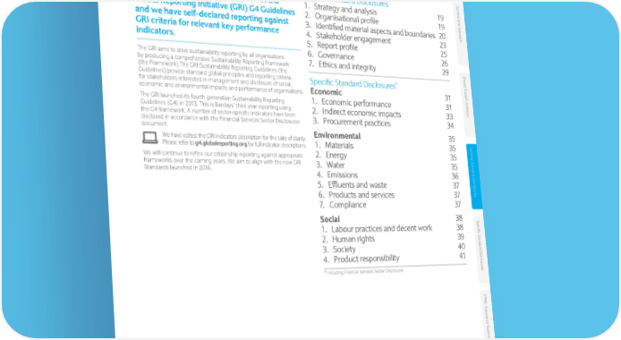 Global Reporting Initiative G4 disclosures Page Barclays’ disclosures have been prepared Con General Standard Disclosures t e in accordance with the Core option of the 1. Strategy and analysis 19 xt and Appr Global Reporting Initiative (GRI) G4 Guidelines 2. Organisational profile 19 o and we have self-declared reporting against 3. Identified material aspects and boundaries 20 ach GRI criteria for relevant key performance 4. Stakeholder engagement 23 indicators. 5. Report profile 25 The GRI aims to drive sustainability reporting by all organisations 6. Governance 26 by producing a comprehensive Sustainability Reporting Framework 7. Ethics and integrity 29 Shar (the Framework).The GRI Sustainability Reporting Guidelines (the Guidelines) provide standard global principles and reporting criteria Specific Standard Disclosures* ed Gr o for stakeholders interested in management and disclosure of social, Economic 31 wth Ambition economic and environmental impacts and performance of organisations. The GRI launched its fourth generation Sustainability Reporting 1. Economic performance 31 Guidelines (G4) in 2013. This is Barclays’ third year reporting using 2. Indirect economic impacts 33 the G4 framework. A number of sector-specific indicators have been 3. Procurement practices 34 disclosed in accordance with the Financial Services Sector Disclosures document. Environmental 35 We have edited the GRI indicators description for the sake of clarity. Please refer to g4.globalreporting.org for full indicator descriptions. 1. Materials 35 Gener We will continue to refine our citizenship reporting against appropriate 2. Energy 35 al S frameworks over the coming years. We aim to align with the new GRI 3. Water 35 tandar Standards launched in 2016. 4. Emissions 36 d Disclosur 5. Effluents and waste 37 6. Products and services 37 es 7. Compliance 37 Social 38 Specific 1. Labour practices and decent work 38 S 2. Human rights 39 tandar 3. Society 40 d 4. Product responsibility 41 Disclosur * Including Financial Services Sector Disclosures es KP MG Assur ance S ta t emen t Within this document we report against the Global Reporting Initiative G4 Guidelines and Financial Services Sector Disclosures document. We have self-declared our reporting to be ‘in accordance’ with the Core option of the guidelines. Key Fully disclosed Partially disclosed Not disclosed home.barclays/annualreport Barclays PLC Environmental Social Governance Supplement 2016 • 17