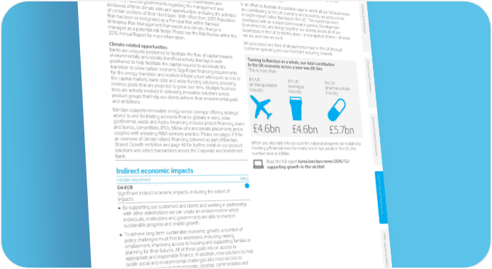 Specific Standard Disclosures Key Fully disclosed Economic Partially disclosed Not disclosed Economic performance We continue to work to understand and measure the impact our Con business makes on society. t e Reputation Risk: As the Paris Agreement comes into force, banks are In an effort to illustrate the positive ways in which all our UK businesses xt and Appr coming under increased pressure from society, shareholders and are contributing to the UK economy and to society, we produced an potentially national governments regarding the management and in-depth report called ‘Barclays in the UK’. This report has been disclosure of their climate risks and opportunities, including the activities o of certain sections of their client base. With effect from 2017, Reputation developed with an independent research partner, Development ach Risk has been re-designated as a Principal Risk within Barclays’ Economics Ltd, and brings together our activity across all of our Enterprise Risk Management Framework and climate change is businesses in the UK to tell the story – in a snapshot of time – of what managed as a potential risk factor. Please see the Risk Review within the we do, and how we do it. 2016 Annual Report for more information. We processed one third of all payments made in the UK through customer spending and our merchant acquiring network. Climate-related opportunities Shar Banks are uniquely positioned to facilitate the flow of capital towards Turning to Barclays as a whole, our total contribution ed Gr environmentally and socially beneficial activity. Barclays is well- to the UK economy across a year was £8.5bn. o positioned to help facilitate the capital required to accelerate the This is more than: wth Ambition transition to a low carbon economy. Significant financing requirements for the energy transition and resilient infrastructure will require access to the UK the UK the UK the capital markets, bank debt and wider funding solutions, providing air transportation beverages pharmaceuticals revenue pools that are projected to grow over time. Multiple business industry industry industry lines are actively involved in delivering innovative solutions across product groups that help our clients achieve their environmental goals and ambitions. Barclays supports renewable energy sector coverage offering strategic Gener advice to and facilitating access to finance globally in wind, solar, geothermal, waste and hydro. Financing includes project financing, loans al S and bonds, convertibles, IPOs, follow-ons and private placements and is £4.6bn £4.6bn £5.7bn tandar coupled with a leading M&A advisory practice. Please see pages 7-9 for an overview of climate related financing delivered as part of Barclays d Disclosur Shared Growth Ambition and page 46 for further detail on our product When you also take into account the national prosperity we enabled by solutions and select transactions across the Corporate and Investment meeting a financial need for nearly one in two adults in the UK, this Bank. number rises to £36bn. es Read the full report home.barclays/news/2016/12/ Indirect economic impacts supporting-growth-in-the-uk.html Indicator requirement Status Specific S G4-EC8 Significant indirect economic impacts, including the extent of tandar impacts d Disclosur ■■ By supporting our customers and clients and working in partnership with other stakeholders we can create an environment in which individuals, institutions and governments are able to invest in es sustainable progress and enable growth. ■■ To achieve long-term sustainable economic growth, a number of policy challenges must first be addressed, including: raising employment, improving access to housing and supporting families in KP planning for their futures. All of these goals rely on access to MG Assur appropriate and responsible finance. In addition, new solutions to help tackle social and environmental challenges also need access to ance S appropriate financing to help innovate, develop, commercialise and scale deployment. ta t emen ■■ Banks play a key role in enabling the flow of capital towards environmentally or socially beneficial activity. A range of business lines t across our firm are actively involved in delivering solutions across product groups, geographies and industry sectors. home.barclays/annualreport Barclays PLC Environmental Social Governance Supplement 2016 • 33