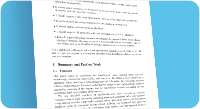 • It should provide support for both legal prose and parameters. • It should support different internal structured formats, such as XML. • It should support the output of execution parameters in a variety of formats, such as FpML. • It should support contracts that comprise multiple documents. • It should manage multiple agreements being instantiated from a single template (and hierarchies of templates). • It should permit parameters to be defined in one document, given a value in a second document, and used in a third document. • It should support a wide range of parameter types, including higher-order parameters. • It should support increasing standardisation and sharing of common code. • It should support multiple execution platforms. • It should support full interaction with, and increasing automation of, legal prose. • It should support Ricardian Contracts, and therefore for example it should support digital signing of contracts, the construction of a cryptographic hash of the contract, and the use of that hash as an identifier for reference and recovery of the smart contract. It is a significant challenge to ask a single specification language to do all of the above. We aim to report on progress in a subsequent academic paper, including an abstract syntax and concrete examples. 4 Summary and Further Work 4.1 Summary This paper began by considering four foundational topics regarding smart contracts: terminology, automation, enforceability, and semantics. We defined a smart contract as an agreement whose execution is both automatable and enforceable. We viewed legal contracts within a simple semantic framework as having two interpretations: the operational semantics concerning execution of the contract and the denotational semantics concerning the non- operational legal interpretation of the contract. We then described templates for legally-enforceable smart contracts as electronic representations of legal documents containing prose and parameters (with each parameter comprising an identifier, a type and an optional value). Agreements are then fully-instantiated templates (with all parameters having values), including any customised legal prose and parameters. By also selecting the appropriate smart contract code, this approach results in the creation of Ricardian Contract triples. The design landscape was then explored including increasing the sophistication of parameters from base types to complex higher-order types to business logic that could be admissible in court and potentially replace the corresponding legal prose. We also explored increasing the use of common standardised code through greater sharing, evolving from 13
