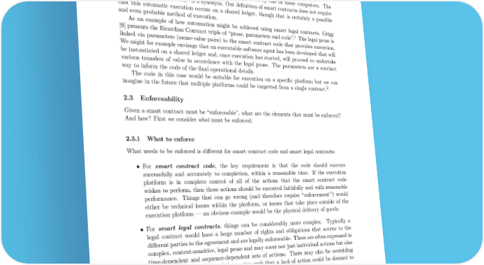 2.2 Automation We have chosen to say that a smart contract “is automatable” rather than that it “is automatically executed” because in practice there are parts of a legal agreement whose execution might not be automatic and will require human input and control. However, to be a “smart contract” we require that some part of the execution is capable of being automated (otherwise it is not “smart”). Automation is generally taken to mean being executed by one or more computers. The phrase “by electronic means” is a synonym. Our definition of smart contracts does not require that this automatic execution occurs on a shared ledger, though that is certainly a possible and even probable method of execution. As an example of how automation might be achieved using smart legal contracts, Grigg [9] presents the Ricardian Contract triple of “prose, parameters and code”.1 The legal prose is linked via parameters (name-value pairs) to the smart contract code that provides execution. Wemightfor example envisage that an executable software agent has been developed that will be instantiated on a shared ledger and, once execution has started, will proceed to undertake various transfers of value in accordance with the legal prose. The parameters are a succinct way to inform the code of the final operational details. The code in this case would be suitable for execution on a specific platform but we can imagine in the future that multiple platforms could be targetted from a single contract.2 2.3 Enforceability Given a smart contract must be “enforceable”, what are the elements that must be enforced? And how? First we consider what must be enforced: 2.3.1 What to enforce What needs to be enforced is different for smart contract code and smart legal contracts: • For smart contract code, the key requirement is that the code should execute successfully and accurately to completion, within a reasonable time. If the execution platform is in complete control of all of the actions that the smart contract code wishes to perform, then these actions should be executed faithfully and with reasonable performance. Things that can go wrong (and therefore require “enforcement”) would either be technical issues within the platform, or issues that take place outside of the execution platform — an obvious example would be the physical delivery of goods. • For smart legal contracts, things can be considerably more complex. Typically a legal contract would have a large number of rights and obligations that accrue to the different parties to the agreement and are legally enforceable. These are often expressed in complex, context-sensitive, legal prose and may cover not just individual actions but also time-dependent and sequence-dependent sets of actions. There may also be overriding obligations on one or more of the parties such that a lack of action could be deemed to be a wrong-performance or non-performance. 1https://en.wikipedia.org/wiki/Ricardian_Contract 2This could for example be achieved by using the list of parameters to connect the legal prose to a set of smart software agents, e.g. one agent per execution platform. 3