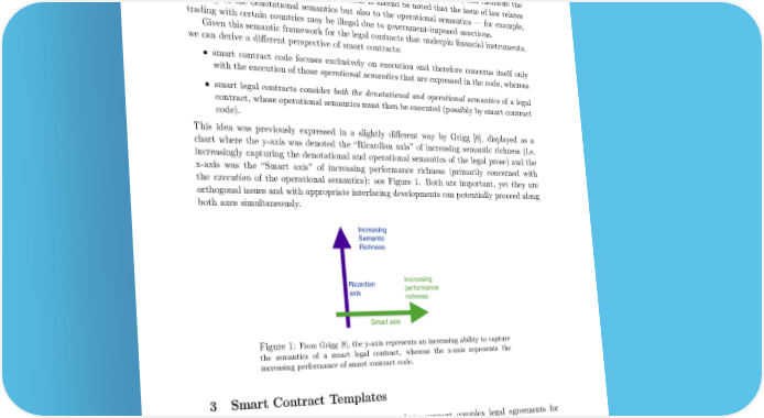 is not always the case and dispute resolution may require a protracted process of negotiated settlement, arbitration or court proceedings. Furthermore, it is important to realise the important role of law. It is not possible to take literally the doctrine that all one needs to know about a contract is contained within “the four corners of the document” [6]. A lawyer would read and understand the contract in the context of the governing law — i.e. each legal document must be interpreted according to the relevant law (corporate law, consumer law, etc) of its stated or inferred jurisdiction, and therefore the semantics of that law must also be understood. It should be noted that the issue of law relates not only to the denotational semantics but also to the operational semantics — for example, trading with certain countries may be illegal due to government-imposed sanctions. Given this semantic framework for the legal contracts that underpin financial instruments, we can derive a different perspective of smart contracts: • smart contract code focuses exclusively on execution and therefore concerns itself only with the execution of those operational semantics that are expressed in the code, whereas • smart legal contracts consider both the denotational and operational semantics of a legal contract, whose operational semantics must then be executed (possibly by smart contract code). This idea was previously expressed in a slightly different way by Grigg [8], displayed as a chart where the y-axis was denoted the “Ricardian axis” of increasing semantic richness (i.e. increasingly capturing the denotational and operational semantics of the legal prose) and the x-axis was the “Smart axis” of increasing performance richness (primarily concerned with the execution of the operational semantics): see Figure 1. Both are important, yet they are orthogonal issues and with appropriate interfacing developments can potentially proceed along both axes simultaneously. Figure 1: From Grigg [8], the y-axis represents an increasing ability to capture the semantics of a smart legal contract, whereas the x-axis represents the increasing performance of smart contract code. 3 Smart Contract Templates Smart Contract Templates provide a framework to support complex legal agreements for financial instruments, based on standardised templates. Following Grigg’s Ricardian Contract triple [9], they use parameters to connect legal prose to the corresponding computer code, with the aim of providing a legally-enforceable foundation for smart legal contracts. Complex sets of legal documentation can be augmented with the identification of operational parameters that are key to directing the executable behaviour of the smart contract 6