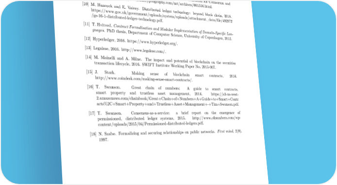 [7] I. Grigg. The Ricardian Contract. In Proceedings of the First IEEE International Workshop on Electronic Contracting, pages 25–31. IEEE, 2004. http://iang.org/papers/ricardian_contract.html. [8] I. Grigg. On the intersection of ricardian and smart contracts, 2015. http://iang.org/papers/intersection_ricardian_smart.html. [9] I. Grigg. The sum of all chains — let’s converge!, 2015. Presentation for Coinscrum and Proof of Work. http://financialcryptography.com/mt/archives/001556.html. [10] M. Hancock and E. Vaizey. Distributed ledger technology: beyond block chain, 2016. https://www.gov.uk/government/uploads/system/uploads/attachment_data/file/492972 /gs-16-1-distributed-ledger-technology.pdf. [11] T. Hvitved. Contract Formalisation and Modular Implementation of Domain-Specific Lan- guages. PhD thesis, Department of Computer Science, University of Copenhagen, 2012. [12] Hyperledger, 2016. https://www.hyperledger.org/. [13] Legalese, 2016. http://www.legalese.com/. [14] M. Mainelli and A. Milne. The impact and potential of blockchain on the securities transaction lifecycle, 2016. SWIFT Institute Working Paper No. 2015-007. [15] J. Stark. Making sense of blockchain smart contracts, 2016. http://www.coindesk.com/making-sense-smart-contracts/. [16] T. Swanson. Great chain of numbers: A guide to smart contracts, smart property and trustless asset management, 2014. https://s3-us-west- 2.amazonaws.com/chainbook/Great+Chain+of+Numbers+A+Guide+to+Smart+Contr acts%2C+Smart+Property+and+Trustless+Asset+Management+-+Tim+Swanson.pdf. [17] T. Swanson. Consensus-as-a-service: a brief report on the emergence of permissioned, distributed ledger systems, 2015. http://www.ofnumbers.com/wp- content/uploads/2015/04/Permissioned-distributed-ledgers.pdf. [18] N. Szabo. Formalizing and securing relationships on public networks. First mind, 2(9), 1997. 15