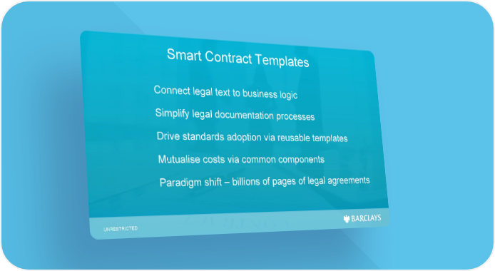 Smart Contract Templates Connect legal text to business logic Simplify legal documentation processes Drive standards adoption via reusable templates Mutualise costs via common components Paradigm shift – billions of pages of legal agreements UNRESTRICTED
