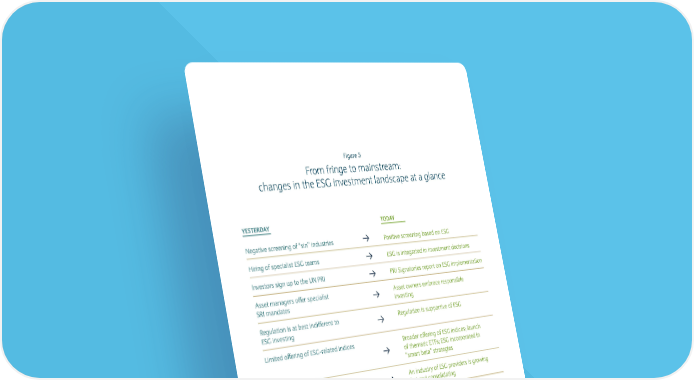 Figure 5 From fringe to mainstream: changes in the ESG investment landscape at a glance YESTERDAY TODAY Negative screening of “sin” industries Positive screening based on ESG Hiring of specialist ESG teams ESG is integrated in investment decisions Investors sign up to the UN PRI PRI Signatories report on ESG implementation Asset managers offer specialist Asset owners embrace responsible SRI mandates investing Regulation is at best indifferent to Regulation is supportive of ESG ESG investing Limited offering of ESG-related indices Broader offering of ESG indices; launch of thematic ETFs; ESG incorporated in “smart beta” strategies Emergence of specialist providers An industry of ESG providers is growing of ESG analysis fast and consolidating Limited ESG disclosure by corporations Corporations develop a Corporate Social Responsibility (CSR) agenda ESG data hard to collect ESG data broadly available. Push for mandatory reporting Active engagement limited to governance Active engagement covers all E, S and G and proxy voting dimensions Source: Barclays Research 18