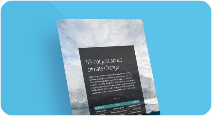 It’s not just about climate change Global warming may be the most widely recognised “poster child” of sustainable investing, but it is far from being the only issue. In fact, ESG ratings reflect a broad range of considerations within each of the three categories. Each ratings provider has a detailed hierarchy of sub-categories and specific issues that are used to arrive at numeric scores for each company. The following table offers a small sampling of the more detailed sets of issues examined by ESG ratings providers to form their E, S and G scores: Figure 6 ENVIRONMENT SOCIAL GOVERNANCE Carbon emissions Labour management Corporate governance Energy efficiency Diversity and discrimination Business ethics Natural resource use Working conditions Anti-competitive practices Hazardous waste management Employee safety Corruption and instability Recycled material use Product safety Anti-bribery policy Clean technology Fair trade products Anti-money laundering policy Green buildings Advertising ethics Compensation disclosure Biodiversity programmes Human rights policy Gender diversity of board Source: MSCI ESG Research, Sustainalytics