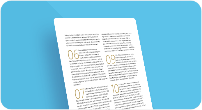 16 But regulation around ESG is now taking shape. One striking widespread. As reported by a large accounting firm , most example is the introduction in August 2015 by the French large listed UK companies now publish comprehensive government of a law on energy transition and green growth corporate social responsibility (CSR) reports, while at which carries mandatory ESG and climate change reporting the turn of the century, only a small proportion of them 12 for listed companies, banks and institutional investors. had environmental policy statements. Also, many large corporations want to be seen as increasing their positive Index publishers have developed contribution to society by being active in CSR – regarded as benchmark indices incorporating ESG synonymous to ESG but from the perspective of the issuer. 06features. Initially, the focus was on ESG-related company data are much equity markets, but ESG bond indices have followed. Many indices can be customised, such as more readily available now, and of for thematic exchange-traded funds, but they may not be 09better quality. Information is still being fully comparable with more encompassing market indices. collected individually by asset managers For example, a focus on high ESG-rated companies may and service providers, but there are significant initiatives introduce differences in allocation in favour of a larger to standardise non-financial information. Bodies such as size and higher rating quality. Some market participants Sustainability Investor Forums (SIFs), the International therefore advocate the use of “smart beta” ESG strategies Integrated Reporting Council (IIRC), the Global Reporting that combine an ESG theme with the financial objective of Initiative (GRI) and the Sustainable Accounting Standard retaining exposure to rewarded risk factors while being well Board (SASB) are all pushing for mandatory reporting 13. standards of non-financial material information. diversified Collecting data and analysing an issuer’s The interaction between companies and ESG attributes can be hard work. Some investors has become two-way, with large 07asset managers have hired teams of ESG 10 investors and asset owners keen to engage specialists, but many rely on dedicated with issuers on all ESG-related topics. This ESG research providers. ESG analysis often evaluates engagement by investors has existed for a long time, in individual companies, but such scoring of mutual funds particular in the USA, but has been highly focused on has also been introduced by fund research companies such governance issues and proxy voting. Engagement is also a 14 15 17 as Morningstar and MSCI . Their approach currently relatively new phenomenon in Europe. In a recent study , consists of determining the ESG profile of a fund based Sustainalytics estimates that the European engagement on the ESG ratings of its underlying investments. This and voting market has grown to the point where over €6 industry is new, growing fast, and also showing signs of trillion of equity market capitalisation is concerned, up from consolidation as large investors require consistency of €118 billion in 2002. approach across a broad universe of issuers globally and also across the multiple dimensions of E, S and G. These developments, taken together, lead to a single inescapable conclusion: the trend towards sustainable The attitudes of bond issuers, too, have investing is not just a passing fad, but a movement that changed markedly. While ESG disclosure has brought, and will continue to bring, fundamental and 08used to be handled by corporations’ sweeping changes to the investment landscape. investor relations department upon request, ESG transparency and pro-activeness is now 12 See https://www.legifrance.gouv.fr/eli/loi/2015/8/17/DEVX1413992L/ jo#JORFARTI000031045547 13 See for example http://www.scientificbeta.com/#/documentation/latest- 16 See http://www.ey.com/Publication/vwLUAssets/EY-tomorrows- publications/scibeta-low-carbon-multibeta-multistrategy-indices investment-rules-2/$FILE/EY-tomorrows-investment-rules-2.0.pdf 14 See http://www.morningstar.com/company/sustainability/ 17 See http://www.sustainalytics.com/sites/default/files/engagement- 15 See https://www.msci.com/esg-fund-metrics blackboxofvaluecreation-2016.pdf 17