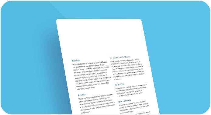 No Liability Not Available In All Jurisdictions To the extent permitted by law, in no event shall Barclays, Not all products or services mentioned are available in nor any affiliate, nor any of their respective officers, all jurisdictions. No offers, sales, resales, or delivery of directors, partners, employees or third party licensors have any products or services described herein or any offering any liability, direct or indirect, including but not limited materials relating to any such products or services may be to (a) any special, punitive, indirect, or consequential made in or from any jurisdiction except in circumstances damages; or (b) any lost profits, lost revenue, loss of which will result with compliance with any applicable laws anticipated savings or loss of opportunity or other financial and regulations and which will not impose any obligations loss, even if notified or advised of the possibility of such on Barclays. damages or potential loss, arising from any use of the information provided herein. Tax Disclaimer No Advice Barclays does not provide tax advice and nothing contained herein should be construed to be tax advice. Accordingly, The information provided does not constitute investment you should seek advice based on your particular advice or take into account the individual financial circumstances from an independent tax advisor. circumstances or objectives of the clients who receive it. You should consult with your own accounting, legal or Intellectual Property other advisors as to the adequacy of this information for © Copyright Barclays Bank PLC (2016). All rights your purposes. reserved. No part of this document may be reproduced No Use For Valuation Purposes or redistributed in any manner without the prior written permission of Barclays. No data or price information should be used for any Barclays Bank PLC is registered in England No. 1026167. valuation, trading, settlement, accounting purposes or other Registered office 1 Churchill Place, London, E14 5HP. related functions. 37