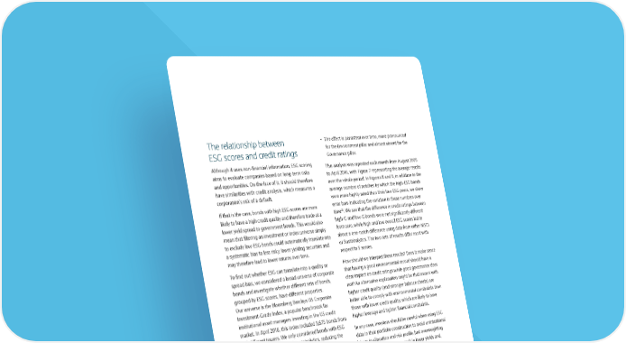 The relationship between • The effect is persistent over time, more pronounced ESG scores and credit ratings for the Environment pillar and almost absent for the Governance pillar. Although it uses non-financial information, ESG scoring This analysis was repeated each month from August 2009 aims to evaluate companies based on long-term risks to April 2016, with Figure 7 representing the average results and opportunities. On the face of it, it should therefore over the whole period. In Figures 8 and 9, in addition to the have similarities with credit analysis, which measures a average number of notches by which the high-ESG bonds corporation’s risk of a default. were more highly rated than their low-ESG peers, we show If that is the case, bonds with high ESG scores are more error bars indicating the variation in these numbers over 20. We see that the difference in credit ratings between likely to have a high credit quality and therefore trade at a time lower yield spread to government bonds. This would also high-G and low-G bonds were not significantly different mean that filtering an investment or index universe simply from zero, while high and low overall ESG scores led to to exclude low-ESG bonds could automatically translate into about a one-notch difference using data from either MSCI a systematic bias to less risky, lower yielding securities and or Sustainalytics. The two sets of results differ most with may therefore lead to lower returns over time. respect to S scores. To find out whether ESG can translate into a quality or How should we interpret these results? Does it make sense spread bias, we considered a broad universe of corporate that having a good environmental record should have a bonds and investigate whether different sets of bonds, clear impact on credit ratings while good governance does grouped by ESG scores, have different properties. not? An alternative explanation might be that issuers with Our universe is the Bloomberg Barclays US Corporate higher credit quality (and stronger balance sheets) are Investment-Grade Index, a popular benchmark for better able to comply with environmental constraints than institutional asset managers investing in the US credit those with lower credit quality, which are likely to have market. In April 2016, this index included 5,675 bonds from higher leverage and tighter financial constraints. 761 different issuers. We only considered bonds with ESG In any case, investors should be careful when using ESG scores from both MSCI and Sustainalytics, reducing the data in their portfolio construction to avoid unintentional sample size by about 10%. biases in allocation and risk profile. Just overweighting We grouped the bonds into high, medium and low ESG better ESG companies can result in lower yields and, buckets and then compared them based on the MSCI and consequently, lower returns. Sustainalytics data. The findings include: • The difference in rating between high and low ESG buckets corresponds to a one-notch change in credit rating. • In repeating this analysis for individual E, S and G scores over different points in time and for the two ESG providers, we observe a very similar effect on credit rating allocation. • The average spread of high-ESG bonds is 38bp lower 20 A one-notch difference in credit rating corresponds to the difference than the low ESG portfolio for MSCI data and 35bp lower between bonds rated Baa1 and Baa2 by Moody’s or between those rated A and for Sustainalytics. A- by S&P. The error bars in the two figures are marked at one standard deviation above and below the average. 24