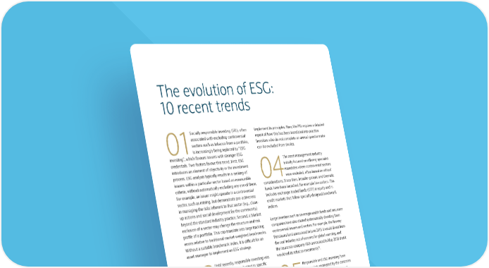The evolution of ESG: 10 recent trends Socially responsible investing (SRI), often implement its principles. Now, the PRI requires a detailed associated with excluding controversial report of how this has been translated into practice. sectors such as tobacco from a portfolio, Investors who do not complete an annual questionnaire 01 is increasingly being replaced by “ESG can be excluded from the list. investing”, which favours issuers with stronger ESG credentials. Two factors favour this trend. First, ESG The asset management industry introduces an element of objectivity in the investment initially focused on offering specialist process. ESG analysis typically results in a ranking of mandates where controversial sectors issuers within a particular sector based on measurable 04were excluded, often based on ethical criteria, without automatically excluding any one of them. considerations. Since then, broader generic and thematic For example, an issuer might operate in a controversial funds have been launched, for example low carbon. This sector, such as mining, but demonstrate pro-activeness includes exchange-traded funds (ETF) in equity and in in managing the risks inherent to that sector (e.g., clean- credit markets that follow specially designed benchmark up actions and social development for the community) indices. beyond the standard industry practice. Second, a blanket exclusion of a sector may change the structure and risk Large investors such as sovereign wealth funds and insurance profile of a portfolio. This can translate into large tracking companies have also started systematically divesting from errors relative to traditional market-weighted benchmarks. controversial issuers and sectors. For example, the Norway Without a suitable benchmark index, it is difficult for an Petroleum fund announced in June 2015 it would divest from asset manager to implement an ESG strategy. the coal industry out of concern for global warming, and the insurance company AXA announced in May 2016 that it Until recently, responsible investing was 10. would sell its tobacco investments a specialist activity limited to specific 02mandates. Now, several large asset Responsible and ESG investing have managers have created specialist ESG been mainly motivated by the concerns teams. Initially, they operated in isolation from the main of asset owners for value alignment. portfolio management teams, but integration is now under 05Regulation did not initially play much of way. ESG analysis is systematically incorporated in the a role and, in some cases, was not seen as supportive. For investment decisions of some large investors, especially example, a 2008 guideline from US pension fund regulation when the investment horizon is long and the asset less ERISA indicated that ESG investing could be seen as a liquid, as is the case for infrastructure and, increasingly, collateral goal that should not distract from maximising corporate bonds. financial performance. Only in October 2015 did the US Department of Labor publish a clarification saying The UN PRI has acted as a catalyst for that it “does not believe ERISA prohibits a fiduciary from making ESG investing an inherent part of 11. incorporating ESG factors” 03the institutional investment process. Its role has changed over time to encourage best practice. When it was created ten years ago, 10 See http://www.axa.co.uk/newsroom/media-releases/2016/AXA-Group- divests-tobacco-industry-assets/ signatories expressed their intent to invest responsibly and 11 See https://www.dol.gov/opa/media/press/ebsa/ebsa20152045.htm 16